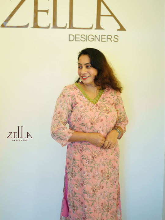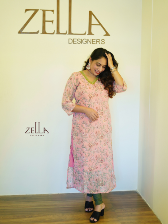 This pink printed designer kurthi combines gentle tones with elegant tailoring for a look that’s both composed and inviting. The subtle floral motifs lend visual interest without overwhelming, while the V-shaped neckline with delicate trim adds a refined finish. Designed with 3/4th sleeves and a flattering straight cut, it ensures comfort and poise throughout the day. Crafted from breathable fabric, this kurthi transitions effortlessly between settings. Its graceful aesthetic makes it a versatile piece that speaks to quiet sophistication and everyday polish.