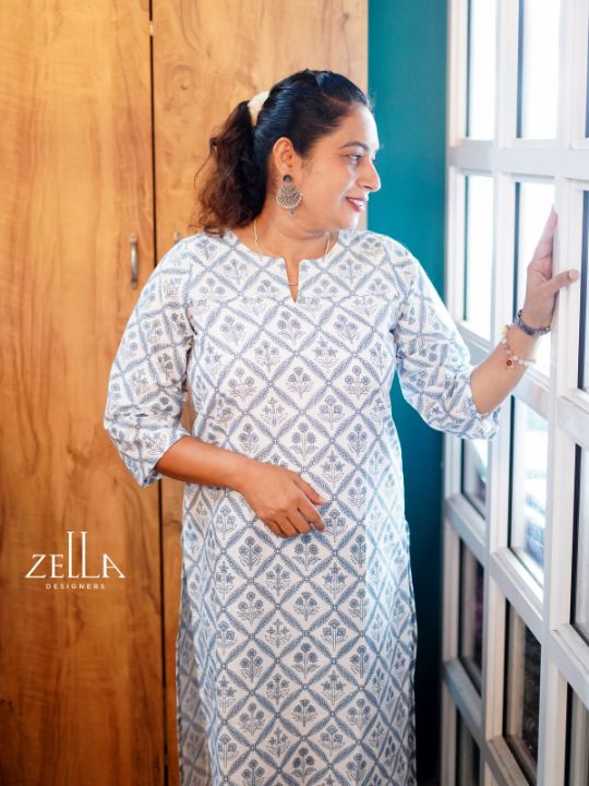 This greyish blue cotton kurthi brings a quiet sophistication to everyday dressing. Decorated with bold ethnic-style prints, it offers a soothing palette and timeless design suited for effortless elegance. The notched neckline and 3/4th sleeves give it a well-balanced structure, while the breathable cotton fabric ensures comfort throughout the day. With its straight-cut silhouette and relaxed drape, it allows freedom of movement without compromising on style. Whether worn for casual errands or relaxed get-togethers, this kurthi combines traditional influence with contemporary simplicity.
