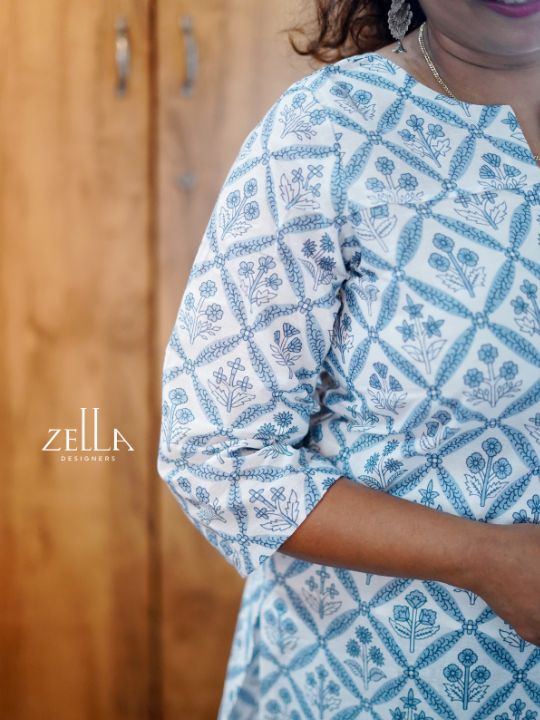 Greyish blue cotton kurthi with bold ethnic prints; airy, soft, and a calm blend of everyday ease, tradition, and style.