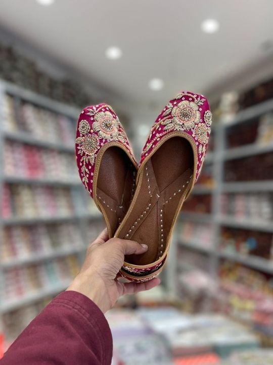 Celebrate elegance with these enchanting pink floral juttis, masterfully crafted to reflect a blend of timeless beauty and modern sophistication. The rich pink base is adorned with detailed thread embroidery in soft gold and pastel hues, forming delicate floral patterns that exude grace and charm. These handcrafted juttis come with a cushioned leather sole, ensuring comfort along with style, perfect for weddings, festivals, or casual ethnic gatherings. Whether paired with a traditional lehenga, an anarkali suit, or styled for a fusion Indo-western look, these juttis promise to enhance every outfit effortlessly.