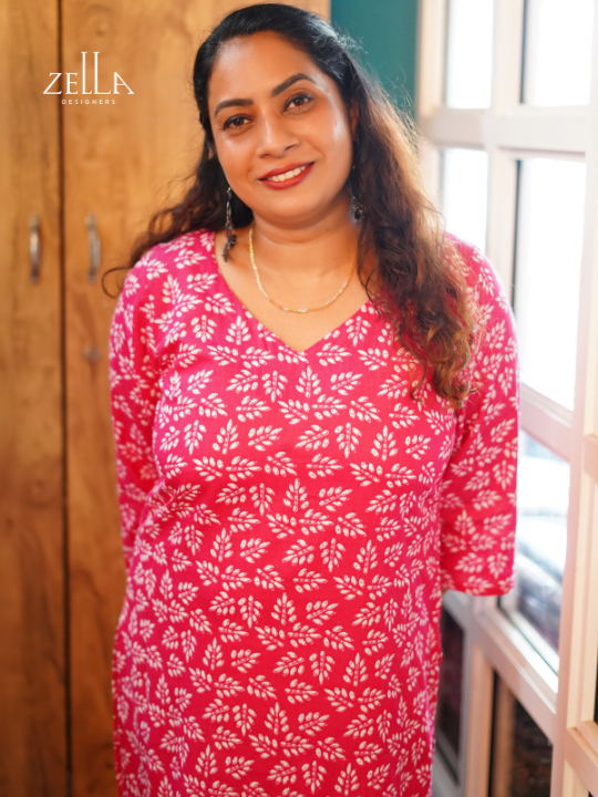 Pink cotton long kurthi with handblock-style prints; soft, airy, and the perfect blend of lively color, comfort, and everyday grace.