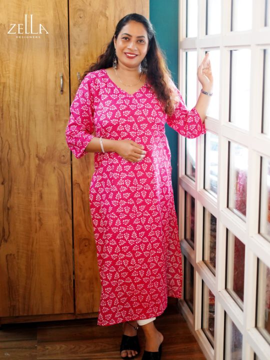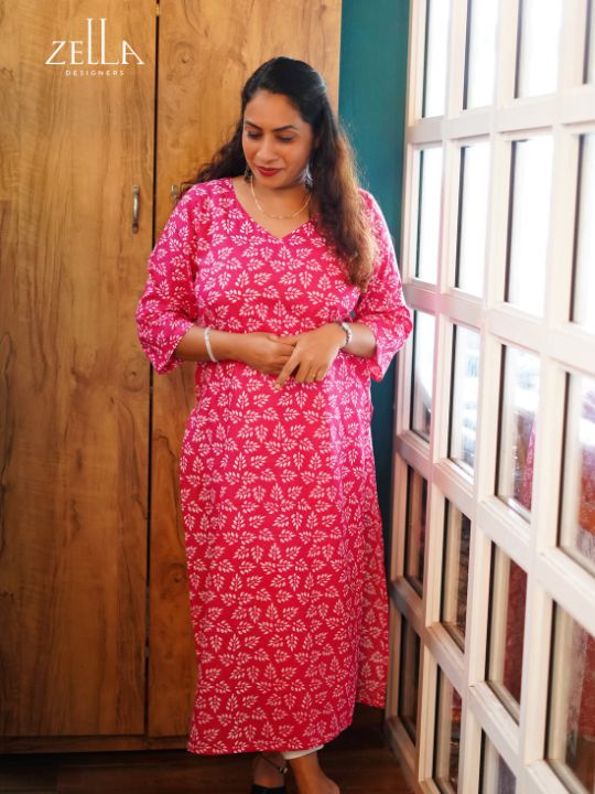 This pink cotton long kurthi brings together artisanal charm and effortless comfort. Decorated with vivid handblock-inspired prints, it showcases a vibrant yet grounded aesthetic suited for everyday wear. The airy cotton fabric ensures breathability and ease, while the 3/4th sleeves and V-neckline offer a comfortable, flattering fit. Its long, flowing silhouette moves with grace, adding a feminine touch to casual styling. Ideal for warm days or relaxed occasions, this kurthi offers a vibrant pop of tradition, making it a reliable and refreshing addition to any wardrobe.