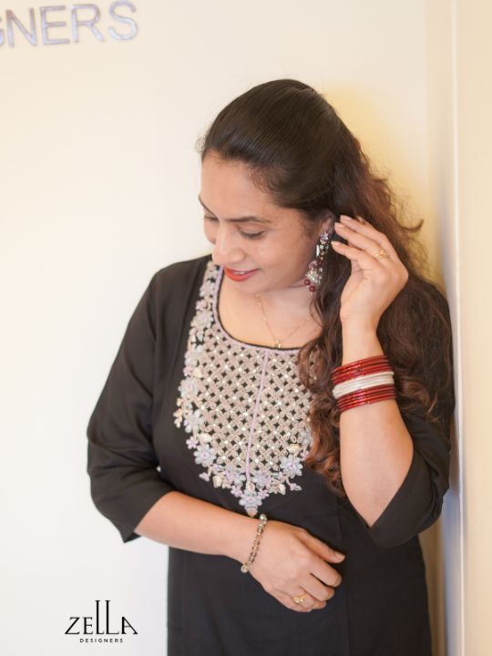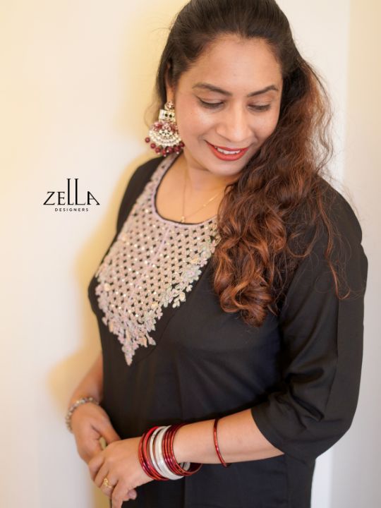 Black hand-worked kurthi for women featuring intricate neck embroidery, a round neckline, and 3/4th sleeves; elegant and comfortable.