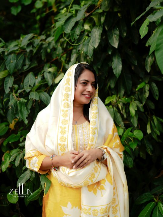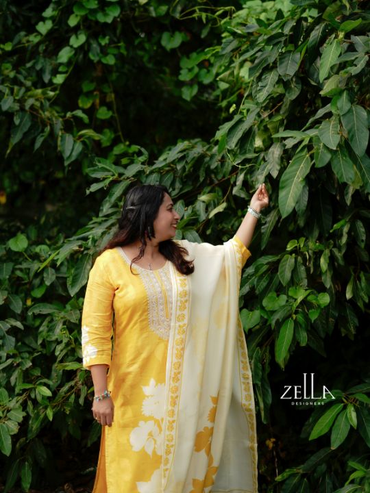 This women’s yellow salwar suit set brings together brightness and grace in a soft, comfortable silhouette. The kurta features delicate printed detailing at the neckline and floral accents on the sleeves and hem, adding a refined yet uplifting touch. Paired with an off-white dupatta featuring matching floral motifs, the set radiates harmony and freshness. The 3/4th sleeves and fluid drape offer ease of movement and a flattering fit. With its cheerful palette and elegant finish, this ensemble adds light, style, and effortless charm to your ethnic wardrobe.
