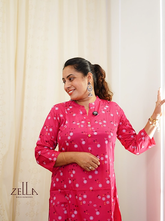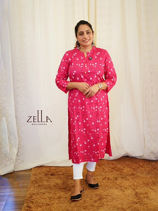 Bright and inviting, this pink rayon kurthi is an everyday staple that merges comfort with soft elegance. Adorned with minimal white scattered motifs, the design keeps things fresh and playful while remaining refined. The notched neckline gives it a structured look without being too formal, and the 3/4th sleeves offer year-round versatility. Crafted in breathable rayon, the kurthi ensures lightness and ease, making it perfect for long wear. Its straight silhouette and modest length make it easy to pair with leggings or palazzos for a put-together yet relaxed outfit.